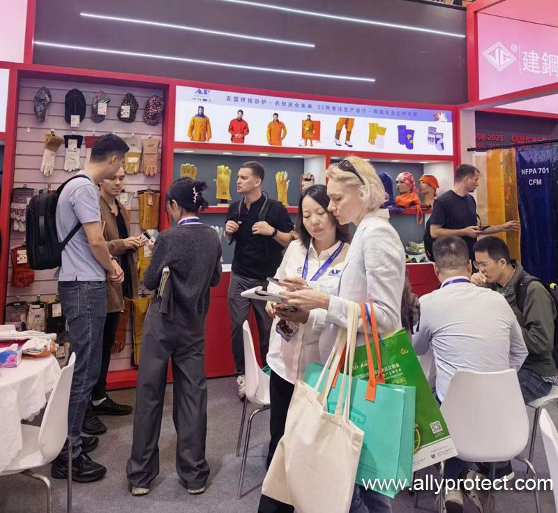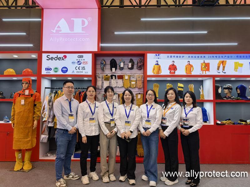 展會現場,友盟防護以紅色為主色調的展位格外醒目,品牌標識“AP(AllyProtect)”與“友盟焊接防護·共創(chuàng)安全未來”的標語熠熠生輝,直觀傳遞出品牌專注焊接防護裝備研發(fā)生產20年的專業(yè)底蘊。展位內,系列焊接防護手套、防火阻燃防護服、防護面罩等核心產品整齊陳列,從基礎防護裝備到高性能定制產品,全面覆蓋焊接作業(yè)不同場景的防護需求,每一件產品都彰顯著友盟對品質的嚴苛把控與技術創(chuàng)新的深耕。