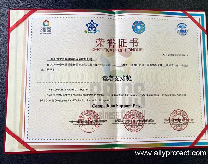 梧州市友盟焊接防護(hù)用品有限公司榮獲2020年一帶一路暨金磚國(guó)家技能發(fā)展與技術(shù)創(chuàng)新大賽競(jìng)賽支持獎(jiǎng)。AP友盟將不遺余力的支持國(guó)家一帶一路發(fā)展的宏偉戰(zhàn)略。