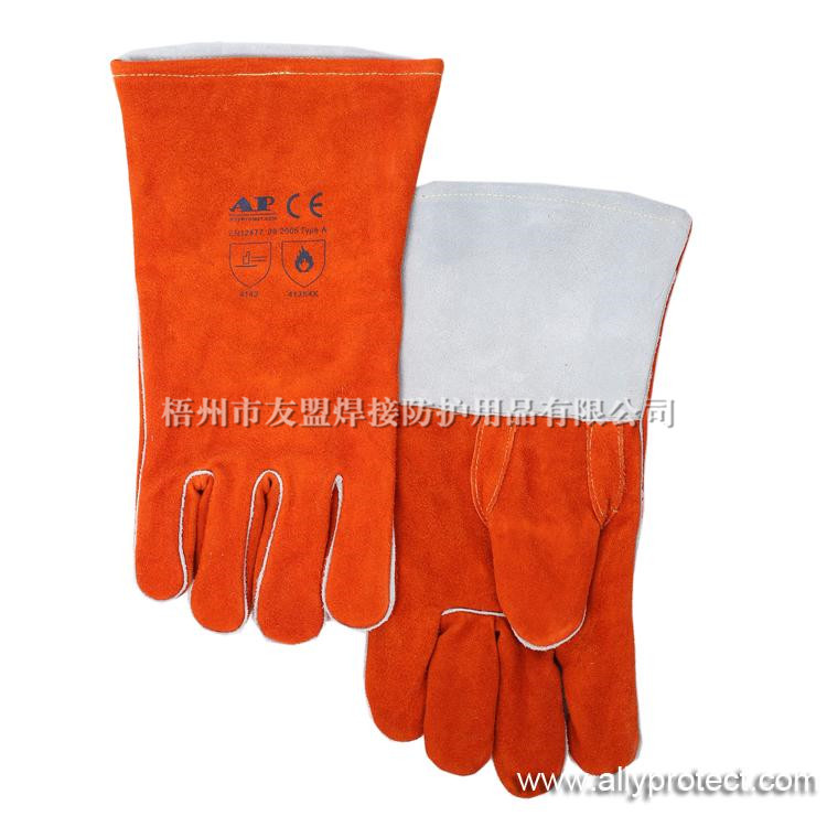 - 產(chǎn)品描述: [ AP ]銹橙色牛二層皮全皮電焊手套,直拇指護縫設計,適用于焊接、切割及搬運等用途。